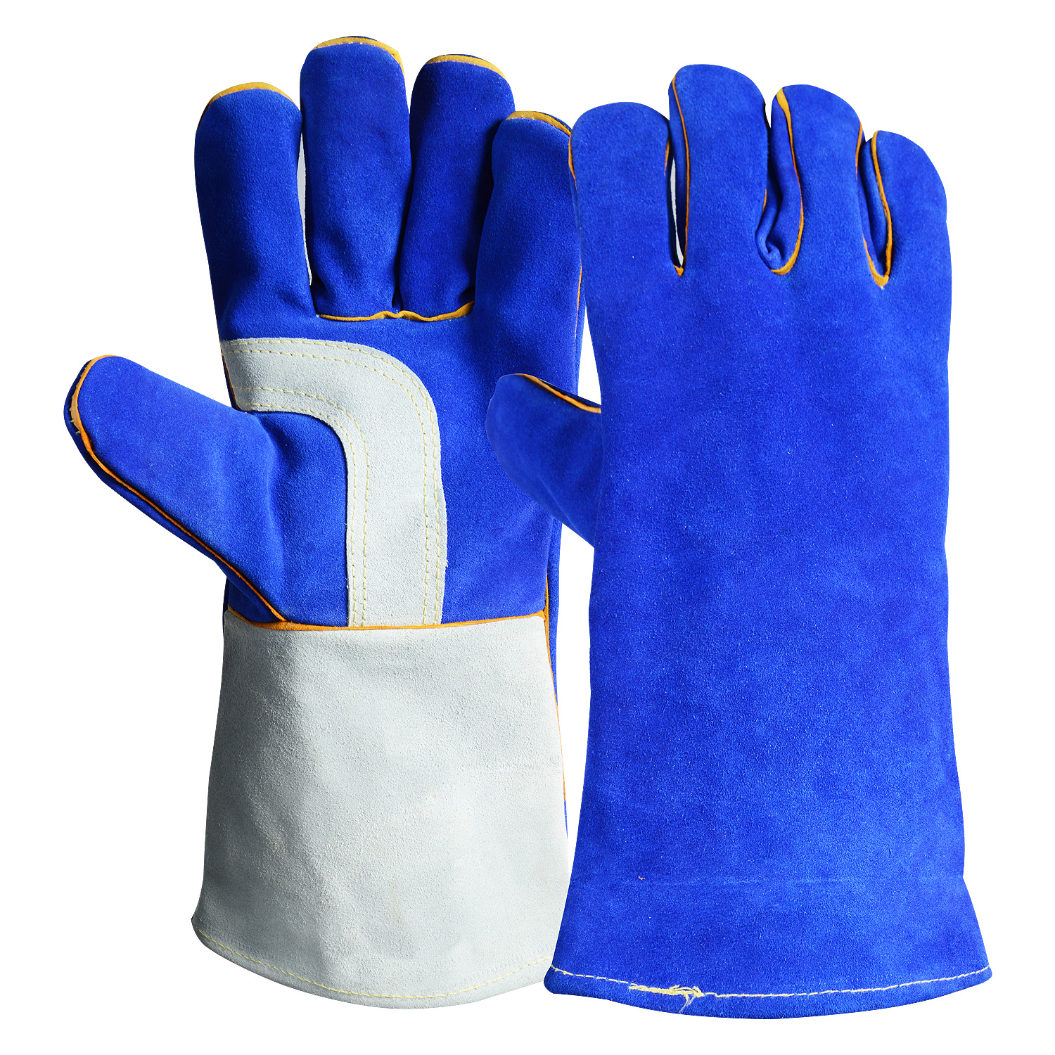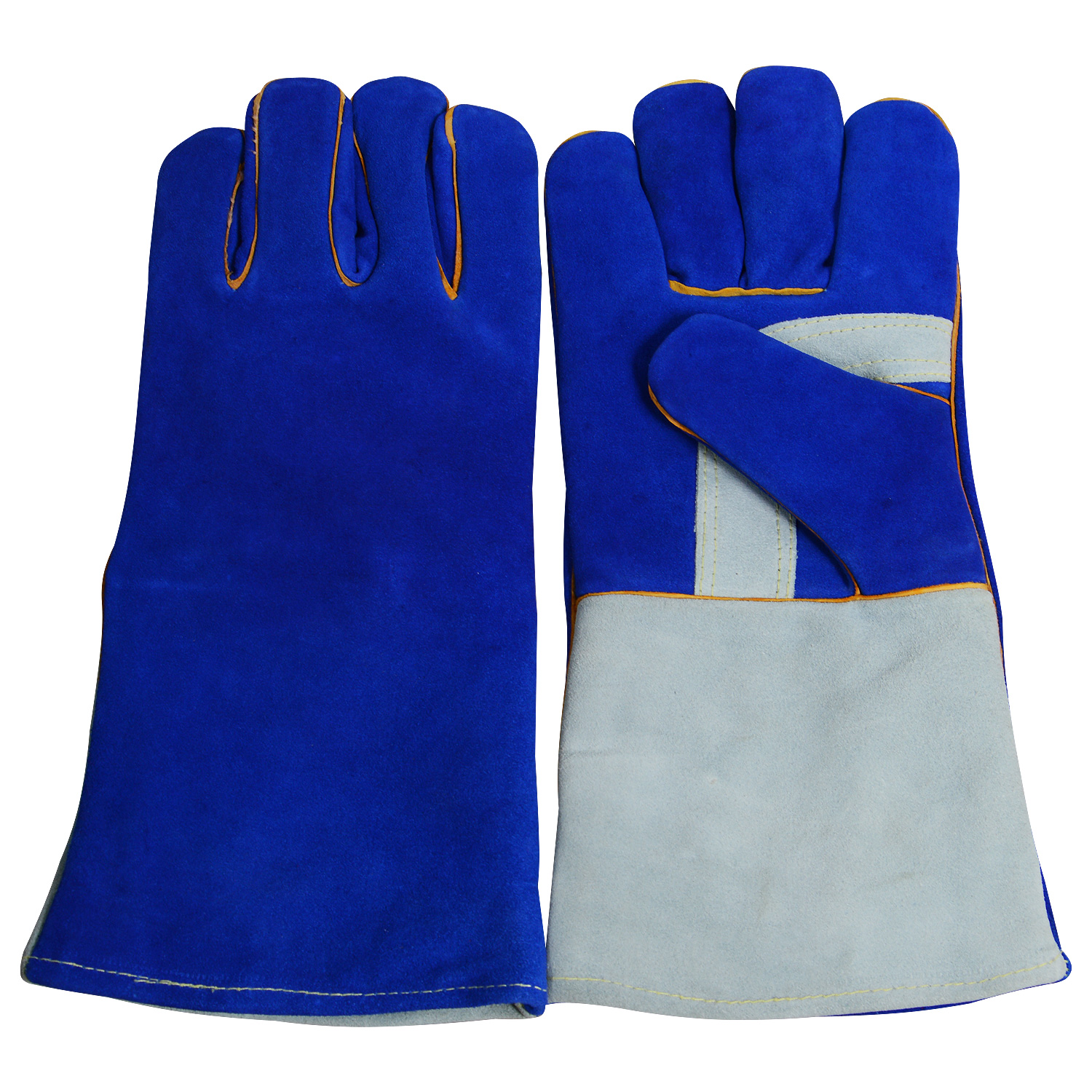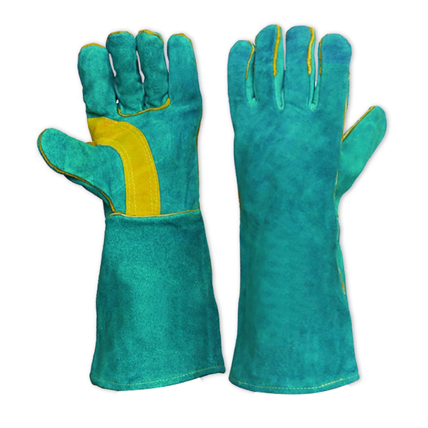 Mig/Mag Welding gloves made in cow split leather, color Ferozi, reinforcement Palm in Yellow color cow split leather, inside fully lined, fully sewn welt, Hemmed cuff, size 14''