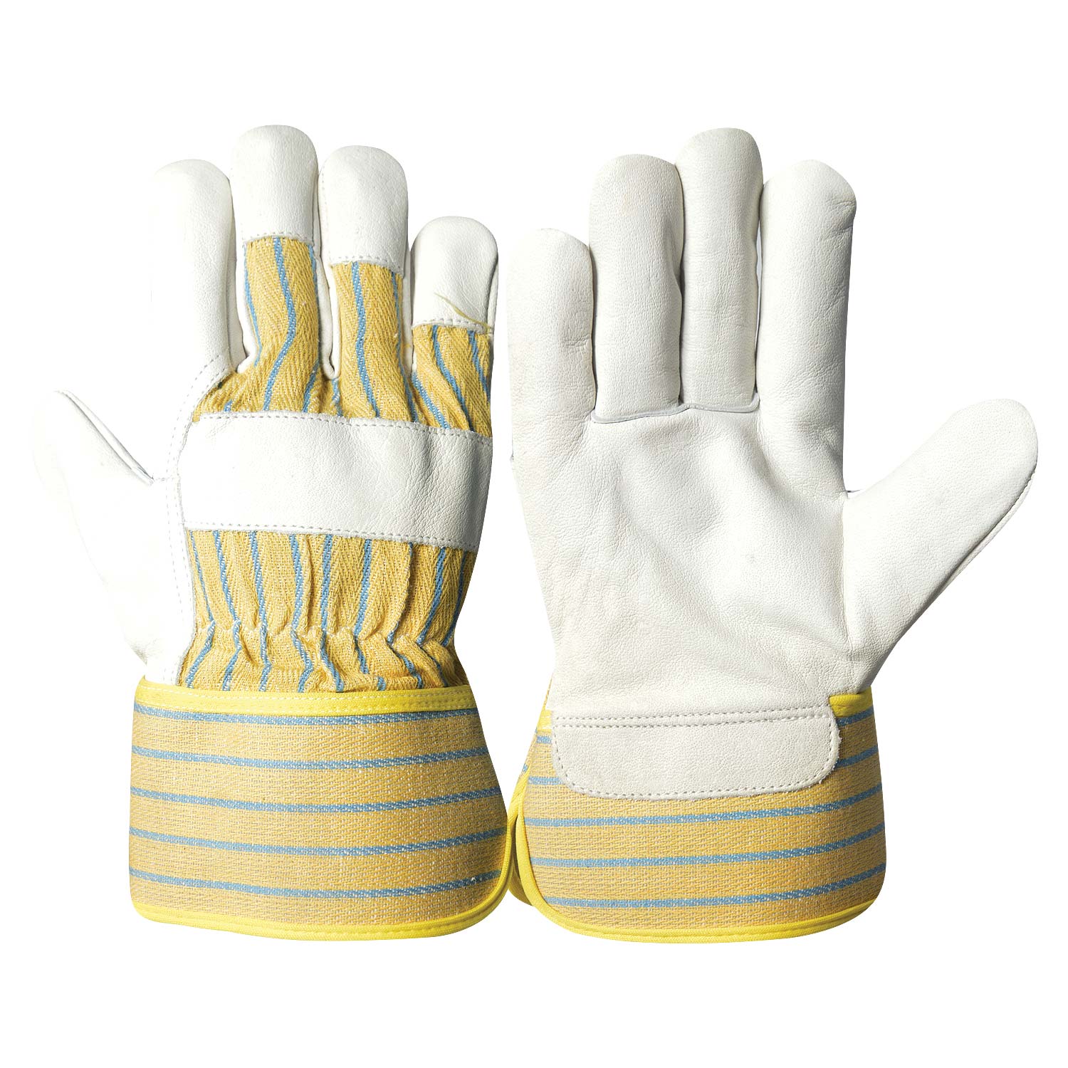 Work gloves made in cow split leather, color natural grey,palm reinforcement of Yellow color cow split leather back side Yellow zean cloth, inside fully lined, Rubberized cuff, size.10''