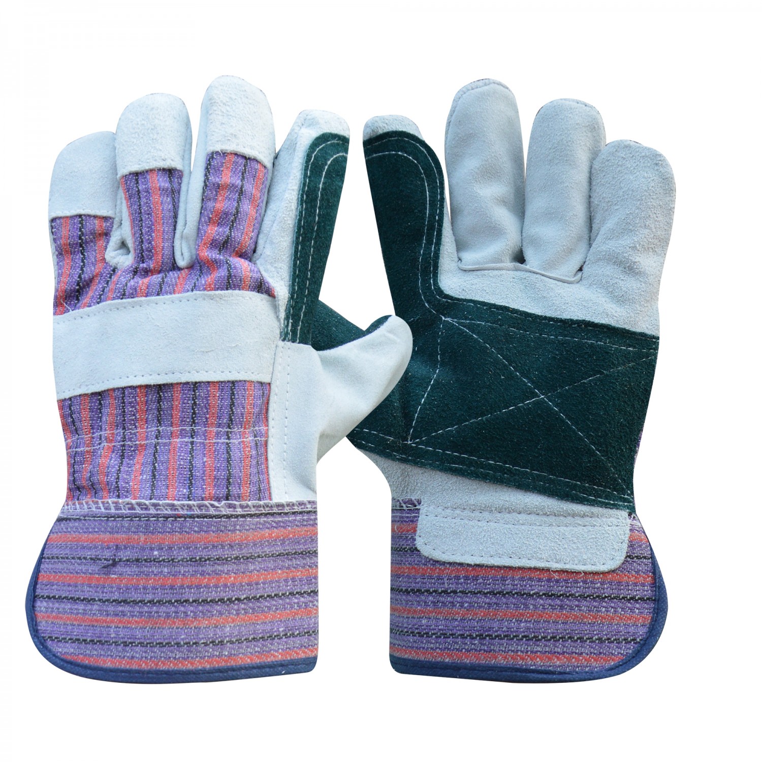 Work gloves made in cow split leather, color natural grey,palm reinforcement of Yellow color cow split leather back side Yellow zean cloth, inside fully lined, Rubberized cuff, size.10''