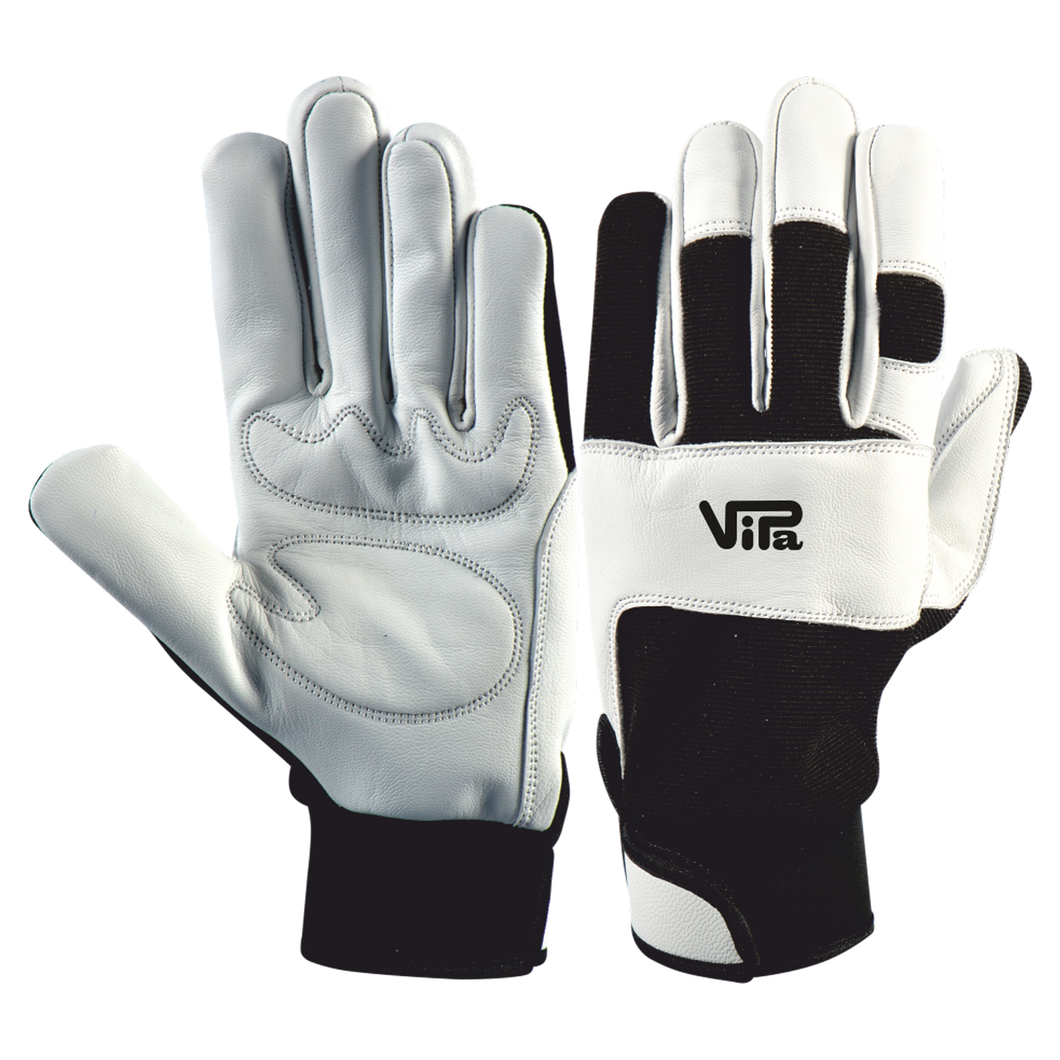 Assembly gloves made in goatskin or sheepskin leather, color white, back side Blue Foreway cloth,  palm reinforcement with foam padding, neoprene cuff with velcro strape closure, size. 10''